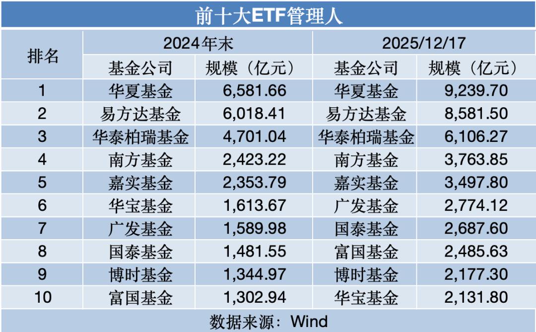 与此同时,行业“马太效应”依旧。截至12月17日,前十大ETF管理人规模合计4.34万亿元,分走了75.48%的市场份额。