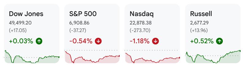 美东时间周四,美股内部出现明显分化。道指小幅收涨,纳指下跌近1.2%,几乎回吐前一日全部涨幅,罗素2000指数则逆势上涨约0.5%。指数层面看似平稳,但结构上已经出现清晰的风格轮动——资金开始从高度集中的科技权重中阶段性流出。