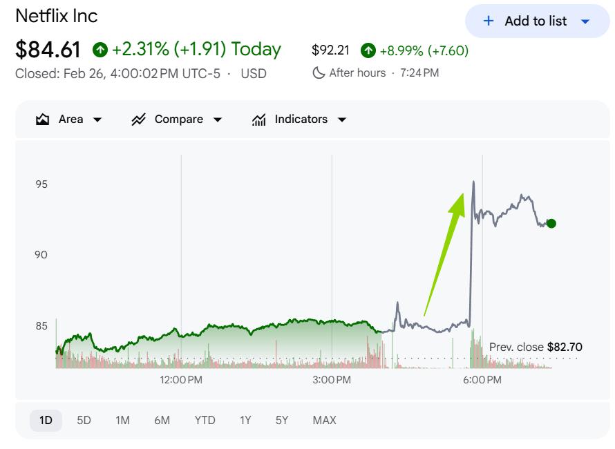 美东时间周四,奈飞(NFLX)在美股盘后大幅上涨约10%。盘后大涨的背后,是公司在华纳兄弟探索(WBD)收购谈判中的关键抉择,以及对自身资本配置策略的调整。这两项消息共同改变了市场对奈飞风险与价值的定价逻辑。