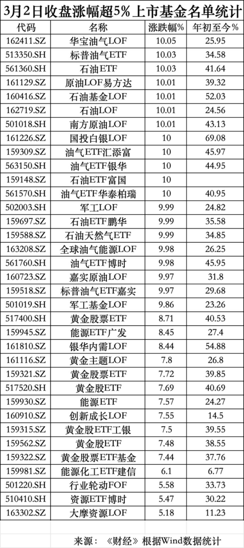 国际油价的走强直接传导至国内相关资产端。A股市场上,油气板块掀起涨停潮,市值较大的中国石油、中国海油、中国石化历史性集体涨停。基金方面,Wind数据显示,2月24日,南方原油LOF、原油LOF易方达涨停。3月2日开盘后,原油基金再度大涨,原油LOF易方达、南方原油LOF、标普油气ETF上午涨幅均超8%。截至收盘,多达20只上市基金涨幅超9%,12只基金涨停。