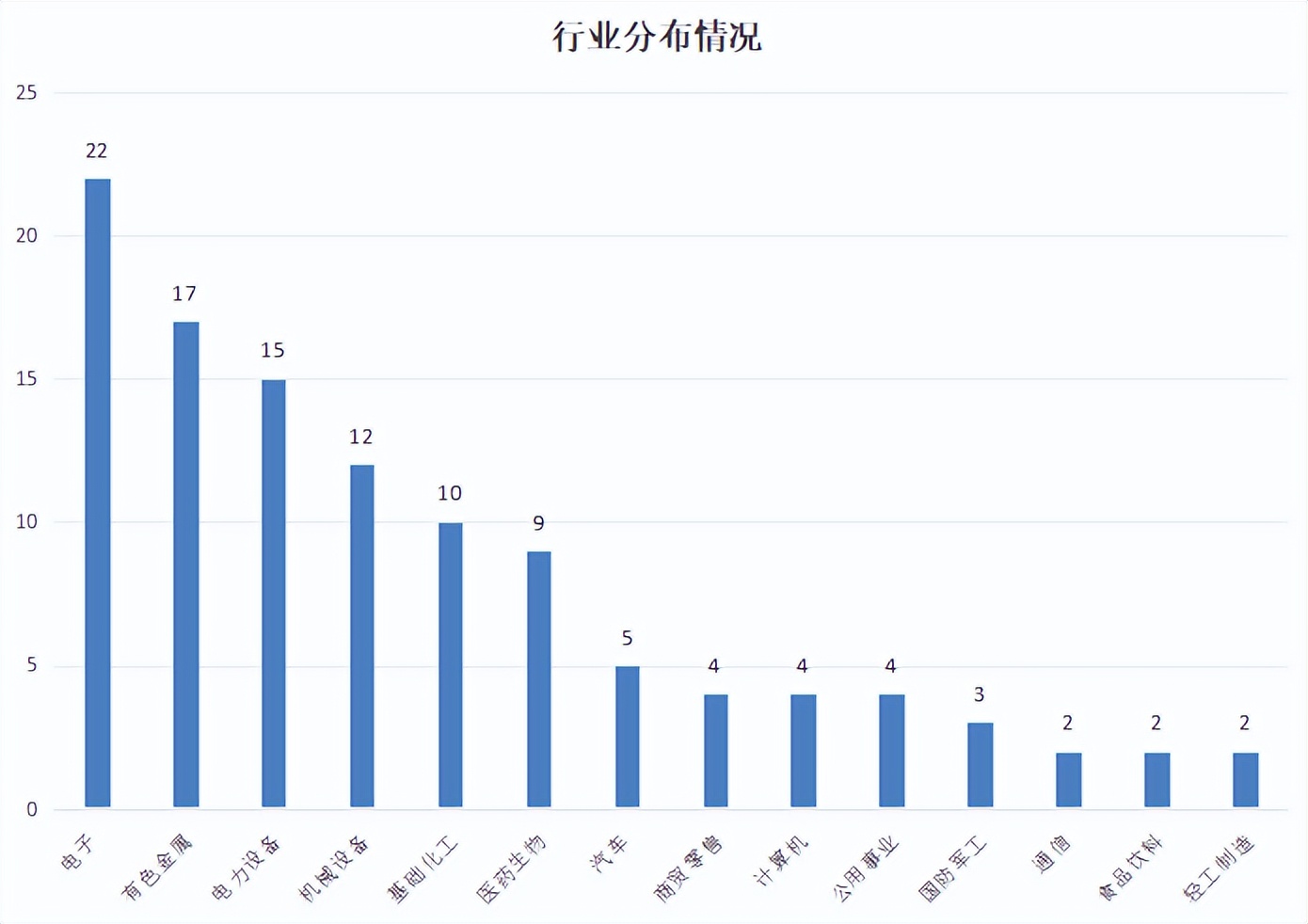 在2026年第一季度业绩预喜的上市公司中,电子行业有22家,有色金属17家,电力设备15家,机械设备12家,基础化工10家。