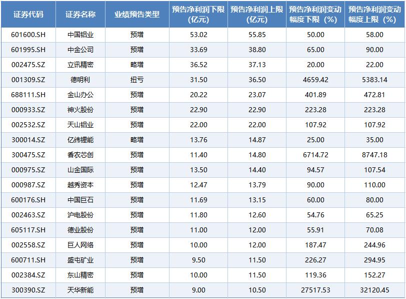 除此以外,德明利(001309.SZ)、金山办公(688111.SH)、神火股份(000933.SZ)、天山铝业(002532.SZ)等公司预计今年第一季度归母净利润上限均超过20亿元。