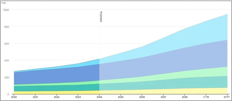 国际能源署(IEA)最新发布的报告指出,到2030年,全球新增用电量将相当于超过两个欧盟当前的用电量总和。其中,数据中心的电力需求将增长一倍以上,达到约945太瓦时。